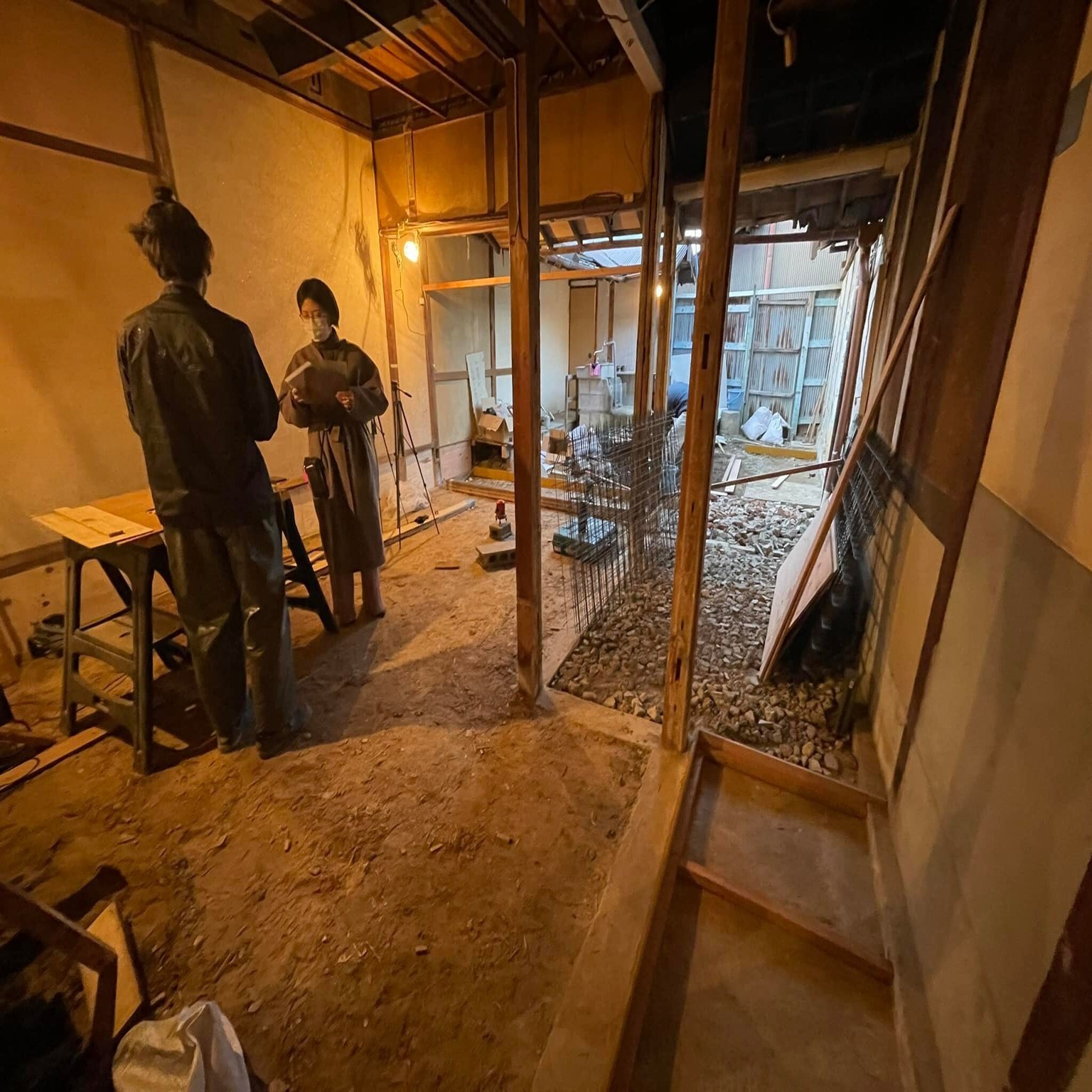2人は、50日間の住み込み作業を通じて、床の板を剥がし、古材を再利用しながら、一つひとつの工程を丁寧に進めた。