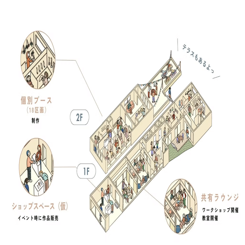 クリエイターたちが互いに刺激を与え合い、時には協力して新しいものを生み出す空間であり、また、ただの制作スペースに留まらず、ここで生まれた作品や活動が人々をつなぎ、地域に新しい息吹を吹き込む拠点となることを目指す。