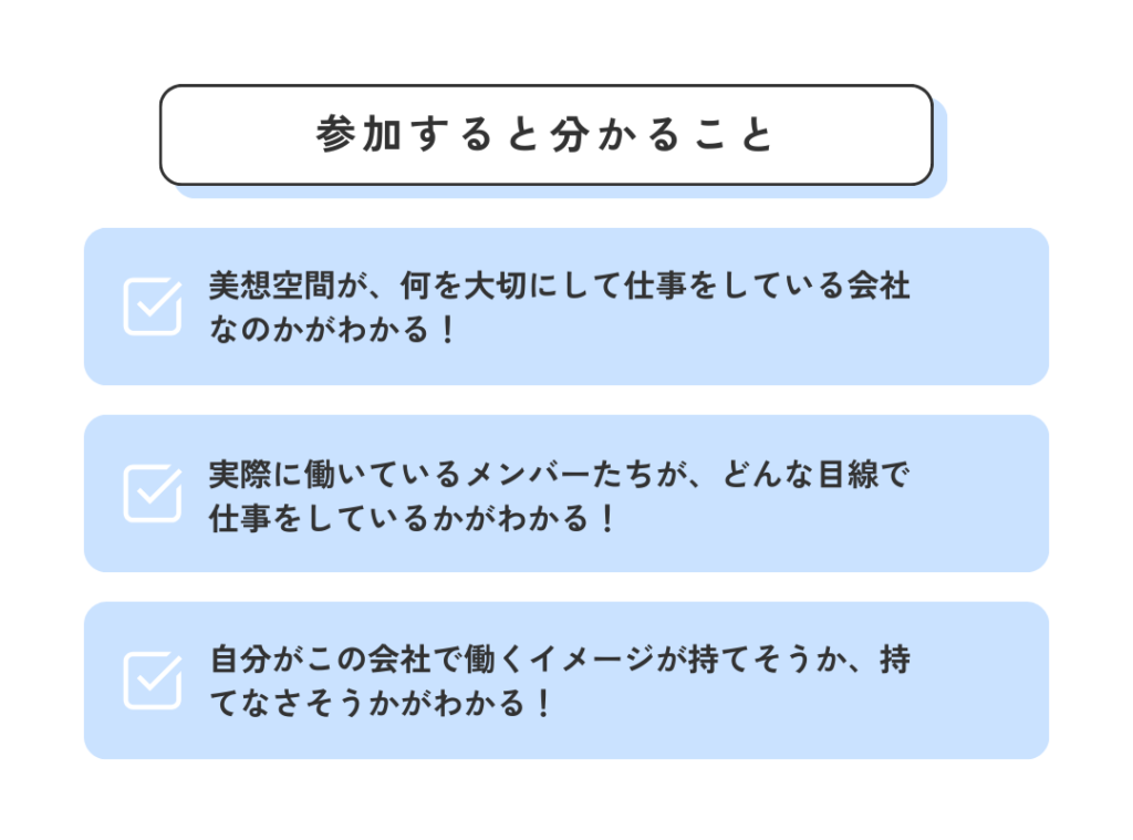 美想空間が、どんな考え方で仕事をしているのか、どんな人たちが働いているのか、自分に合いそうかどうかを、フラットに知ってもらう場なので、「応募するかはまだわからない…」そんな方も大歓迎です!