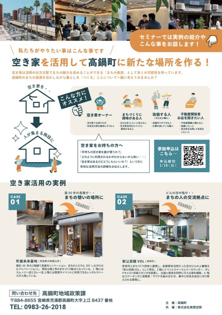 講師は、宮崎市「新公民館 VOL」など、空き家・空きビルを活用した拠点づくりに取り組んできた弊社代表であり新公民館 VOL 館長の鯛島康雄。